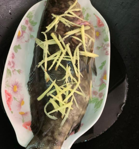 5、姜丝放在划刀处,和鱼腹。